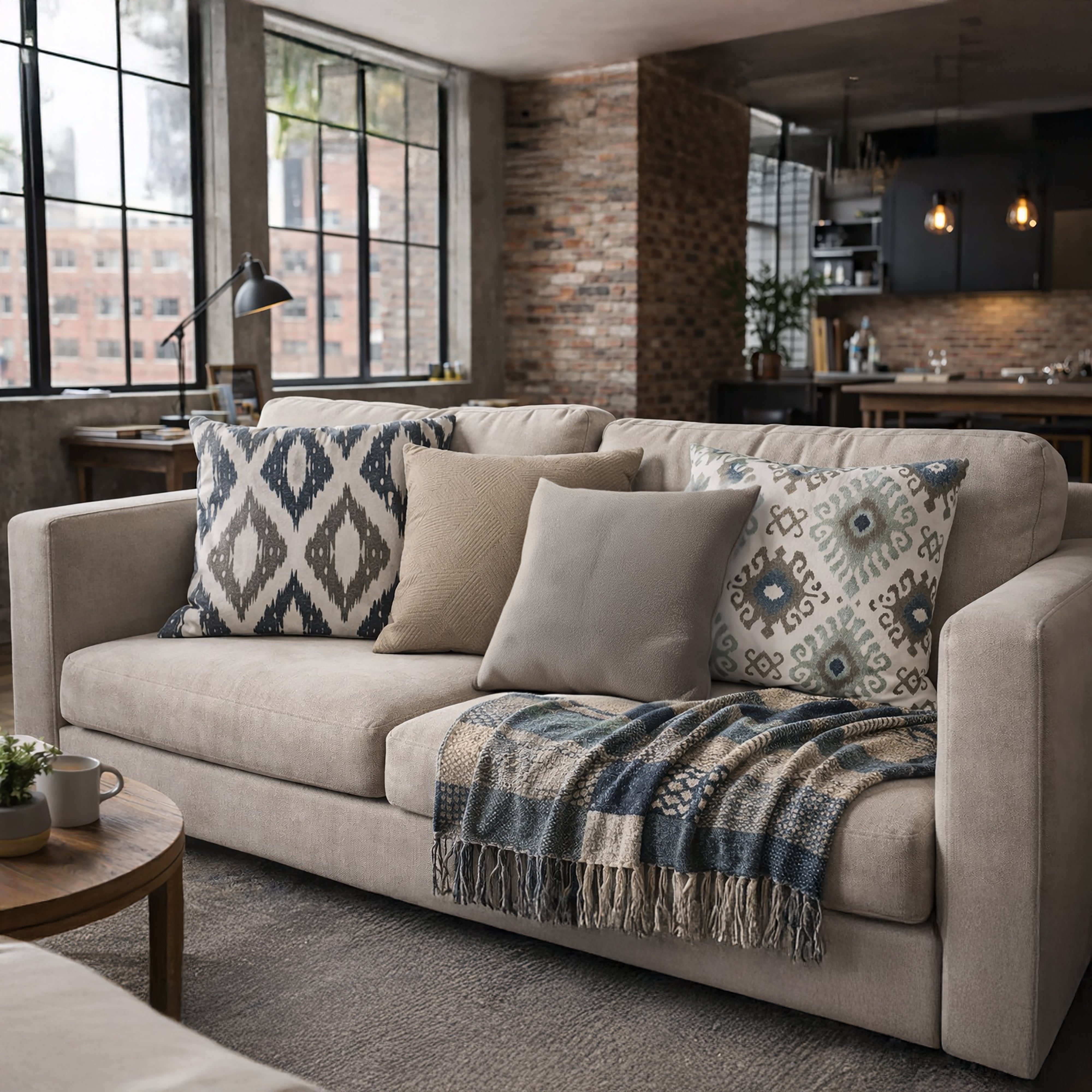 • Urban Style Aztec Pattern Cushion – Beige & Blue, 45x45cm