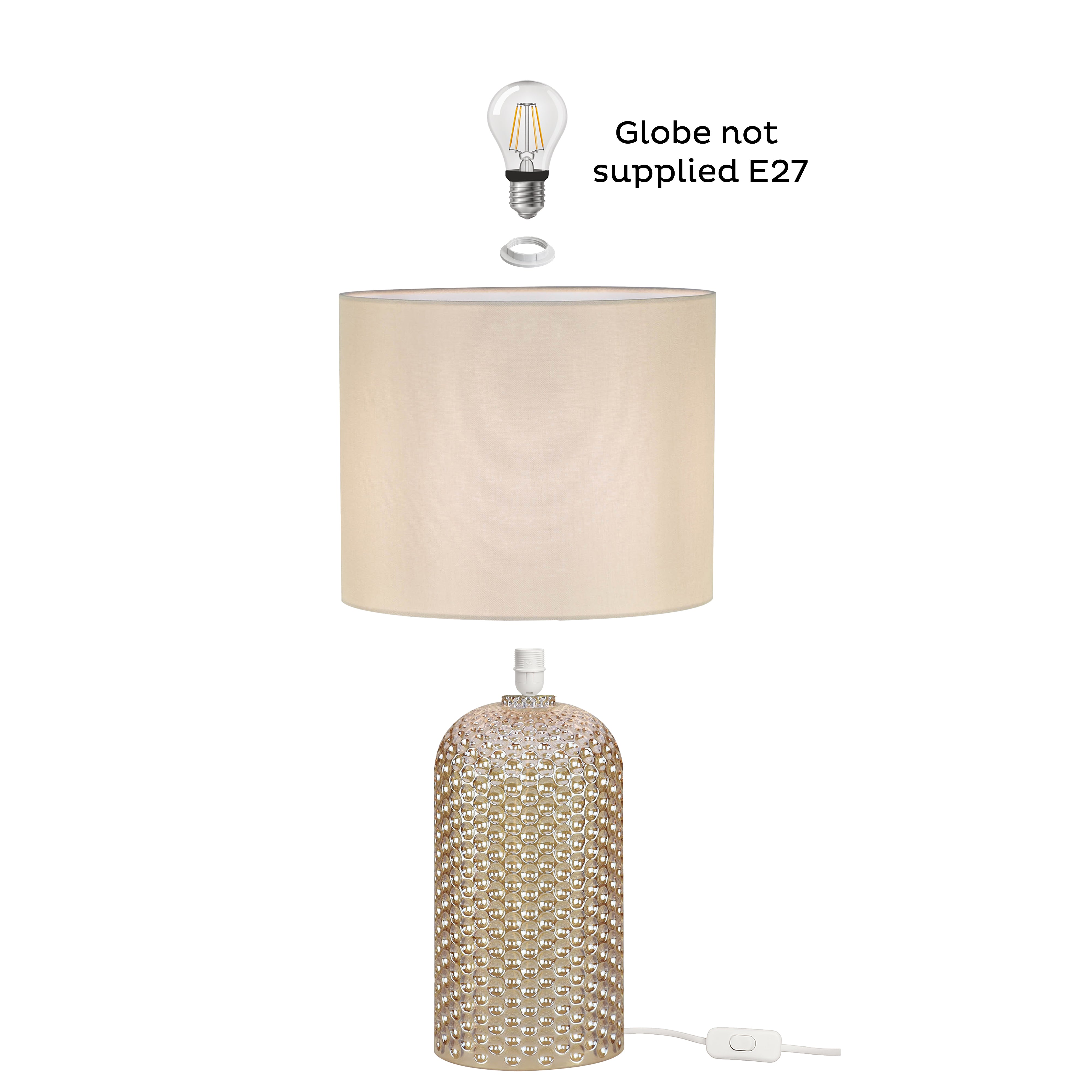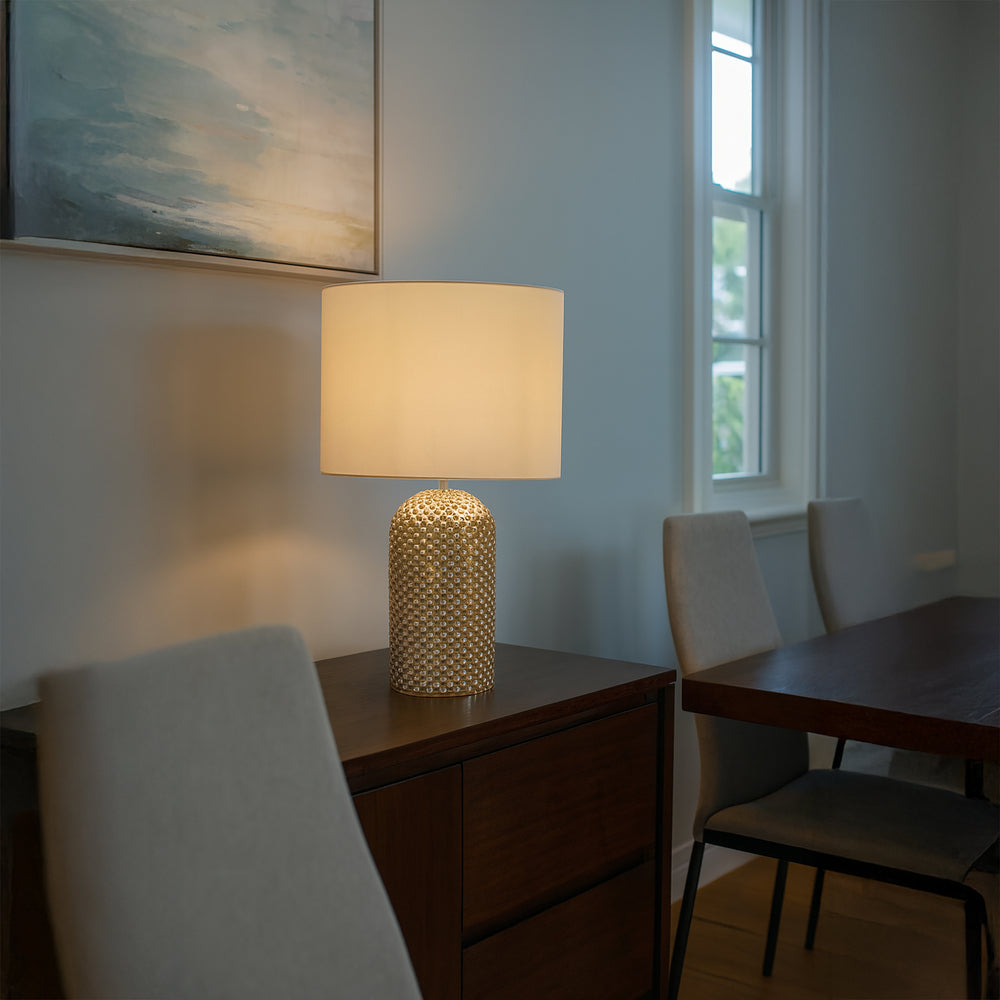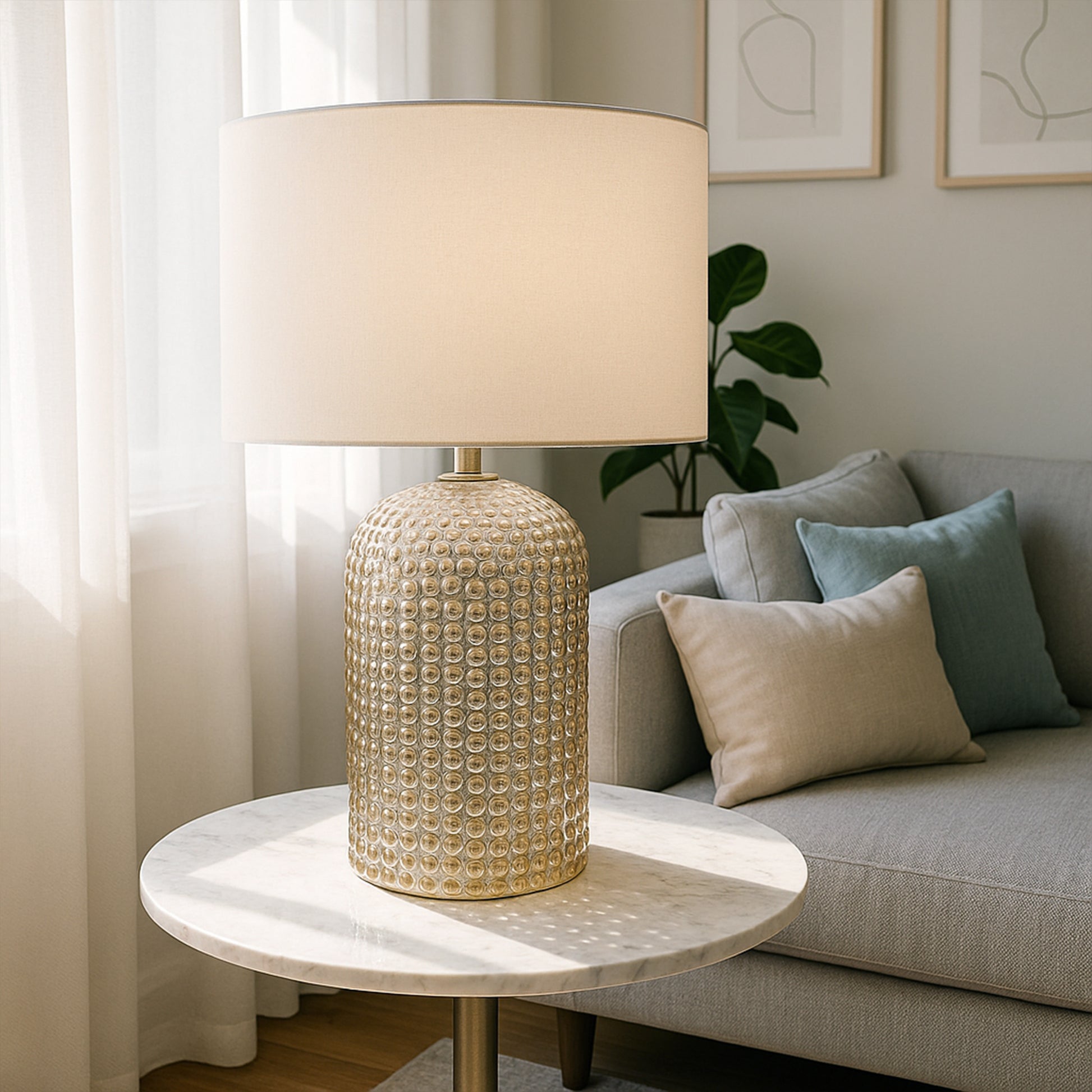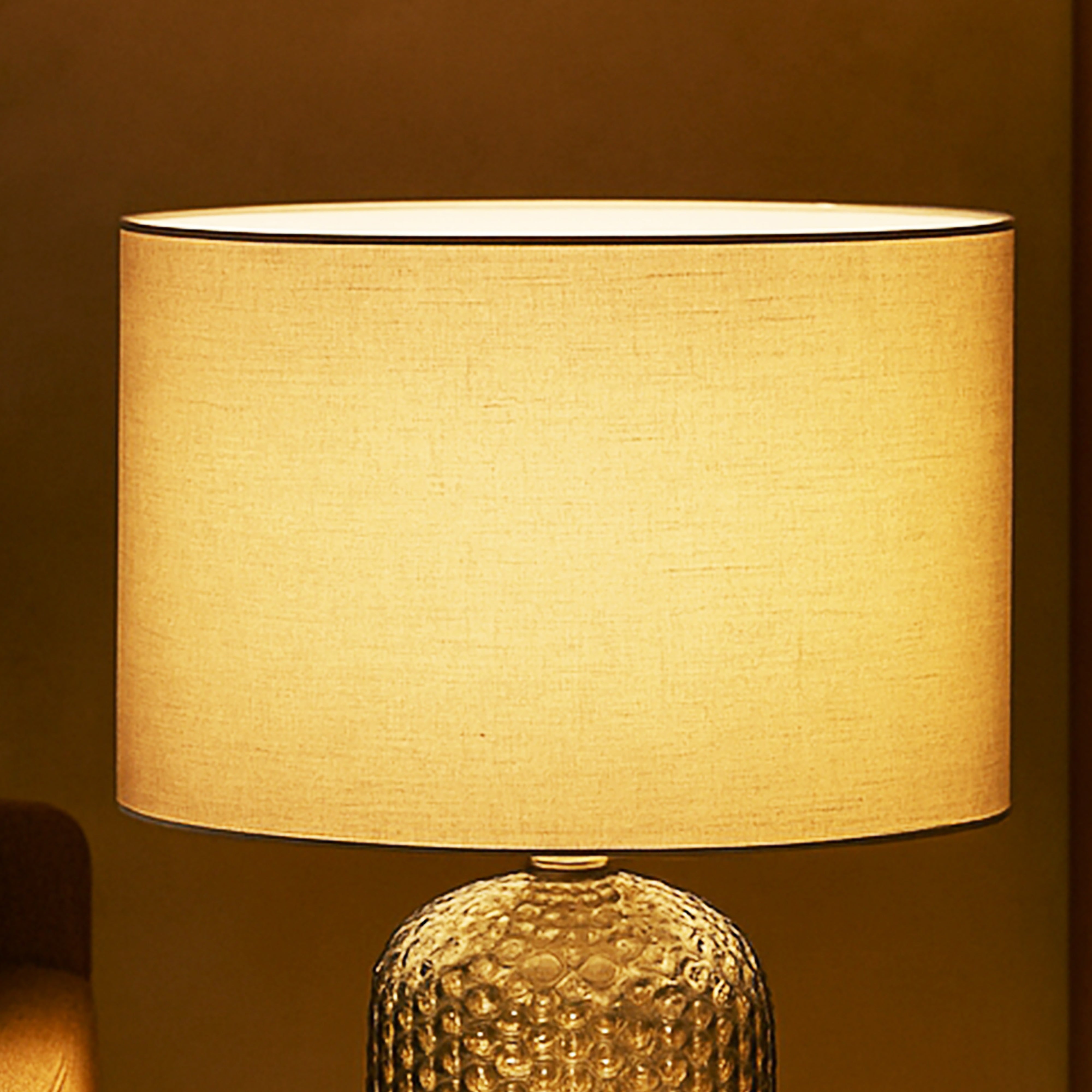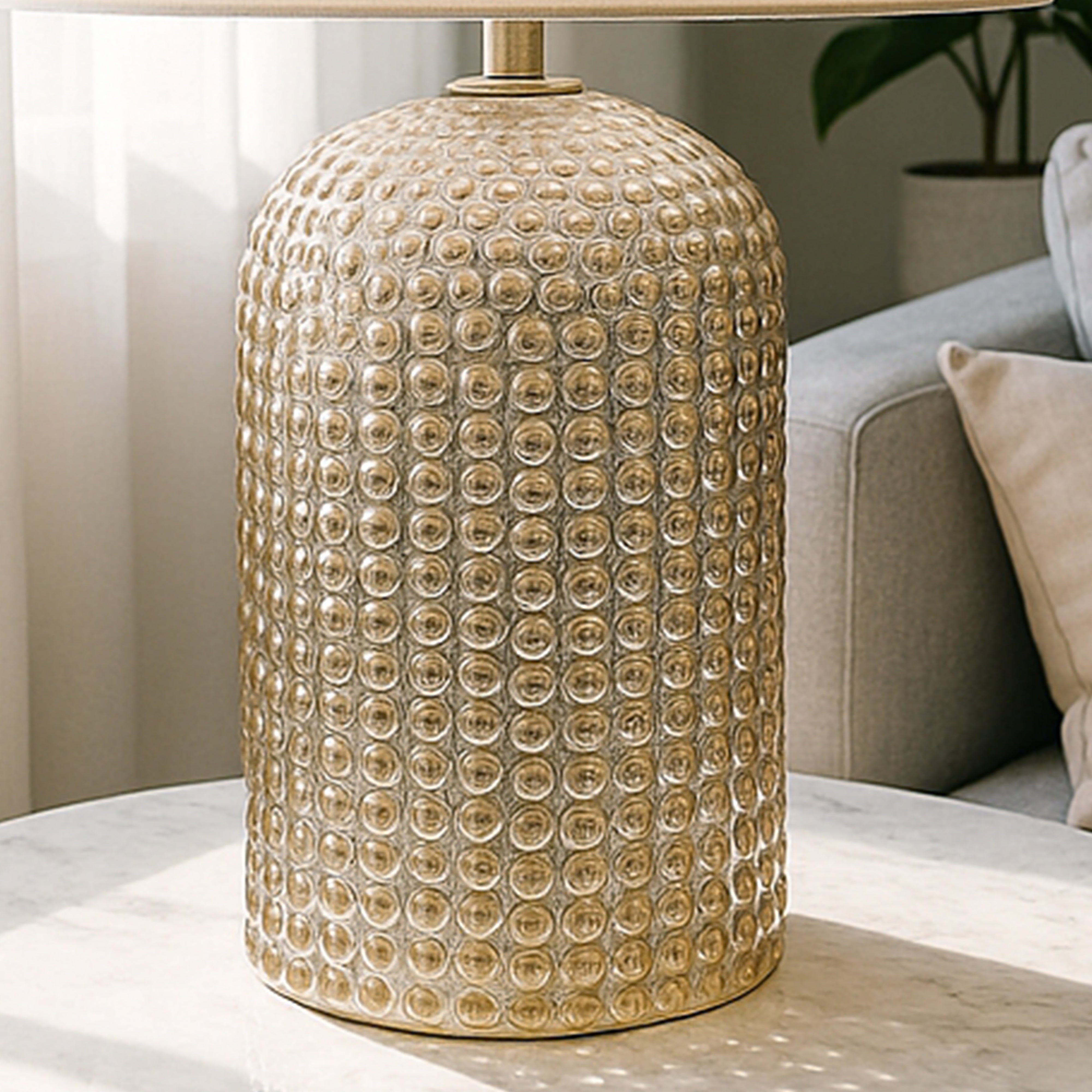 Add depth and softness to your space with the Billie Desktop Lamp by Urban Style. Its gently curved glass base features a unique dotted texture that plays with light even when the lamp is off, while the warm-toned fabric shade casts a calm, ambient glow — perfect for winding down or setting a cosy mood.