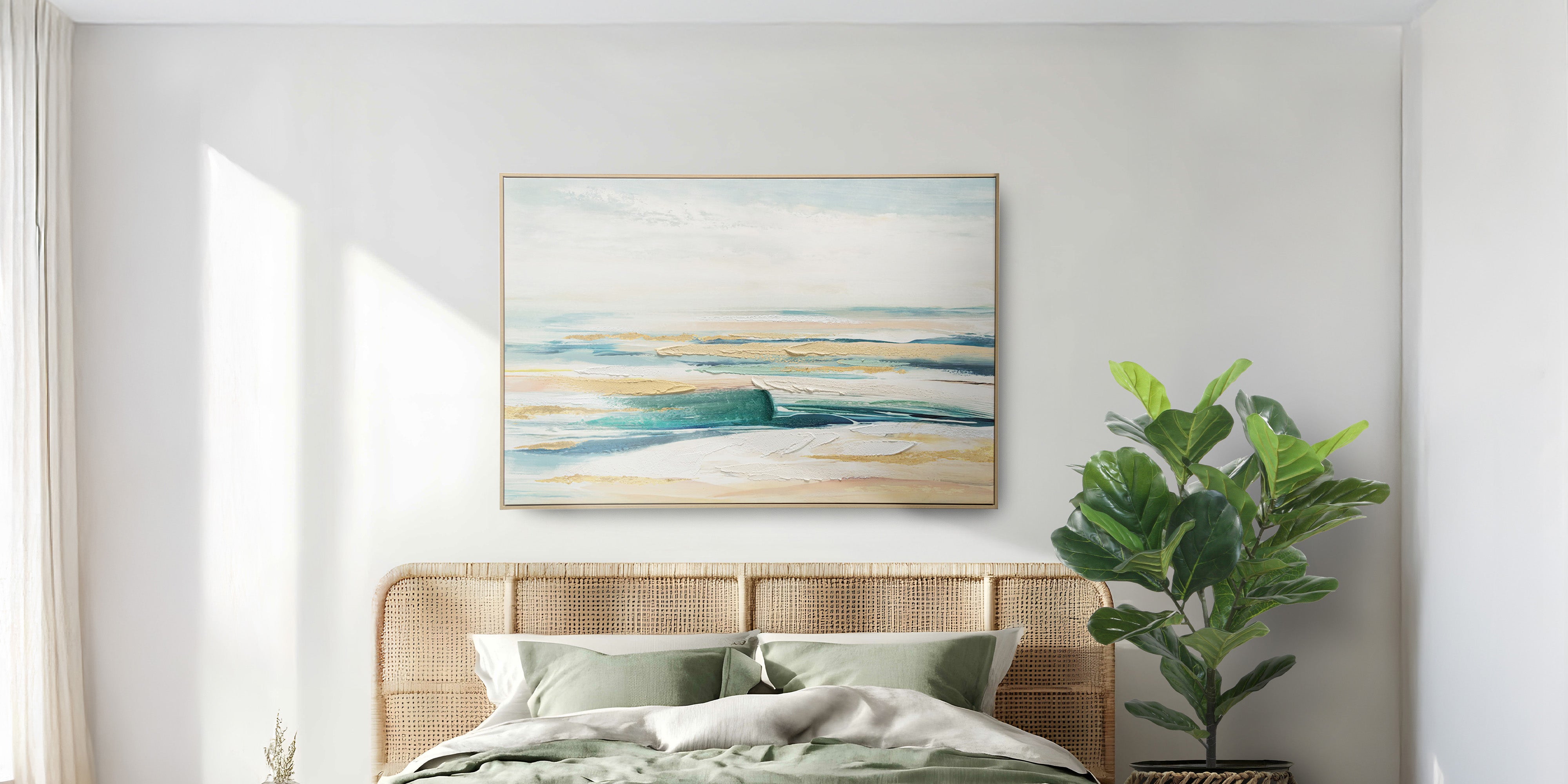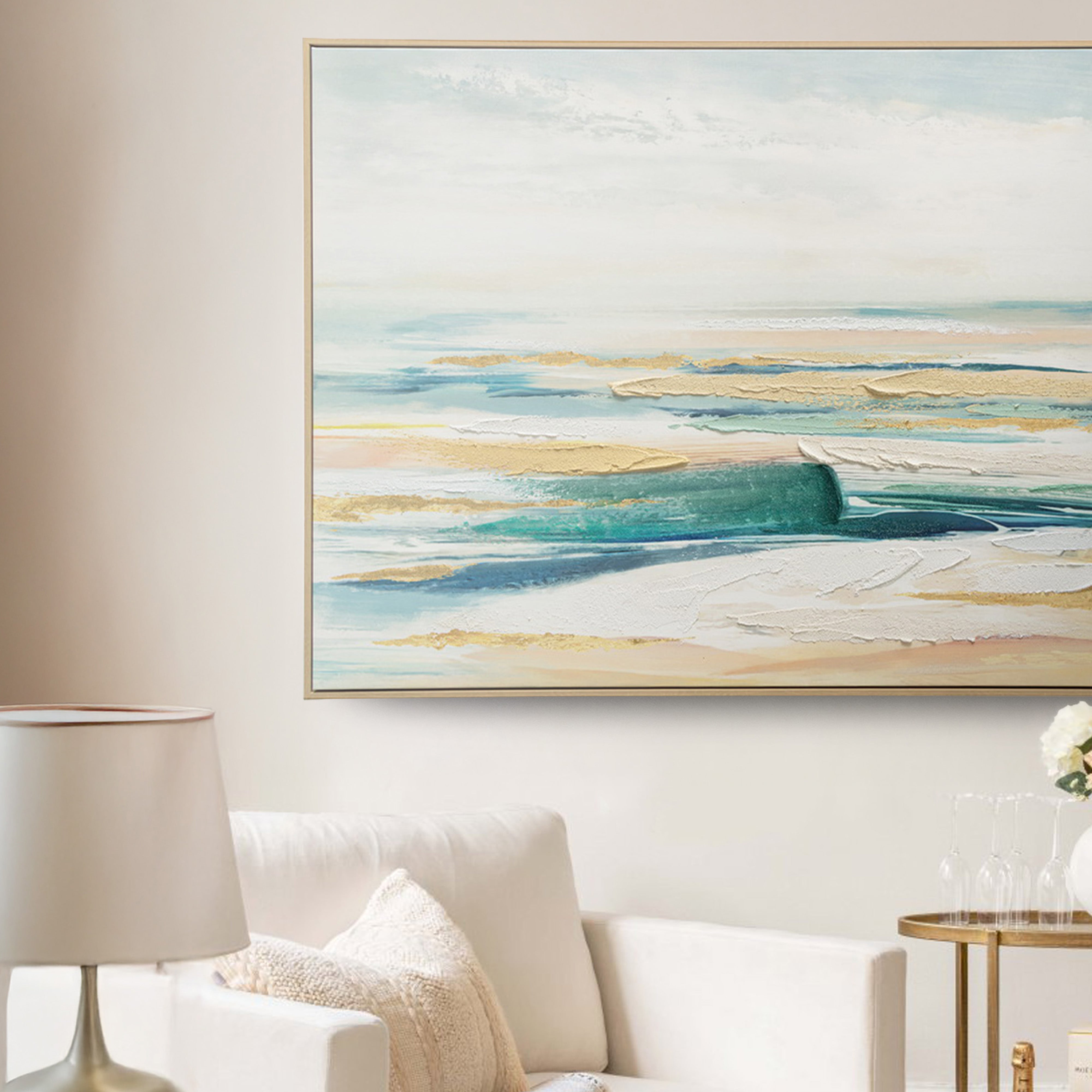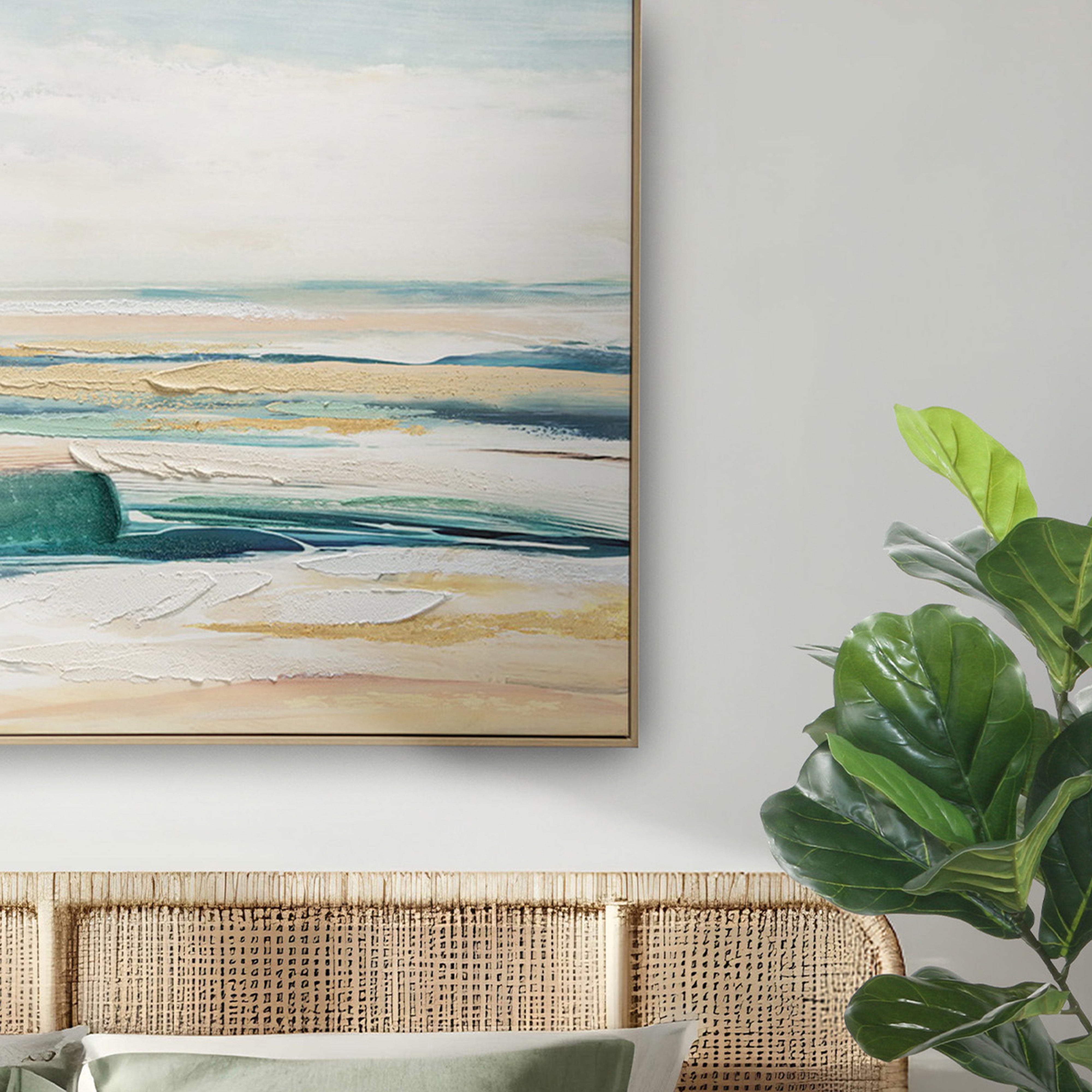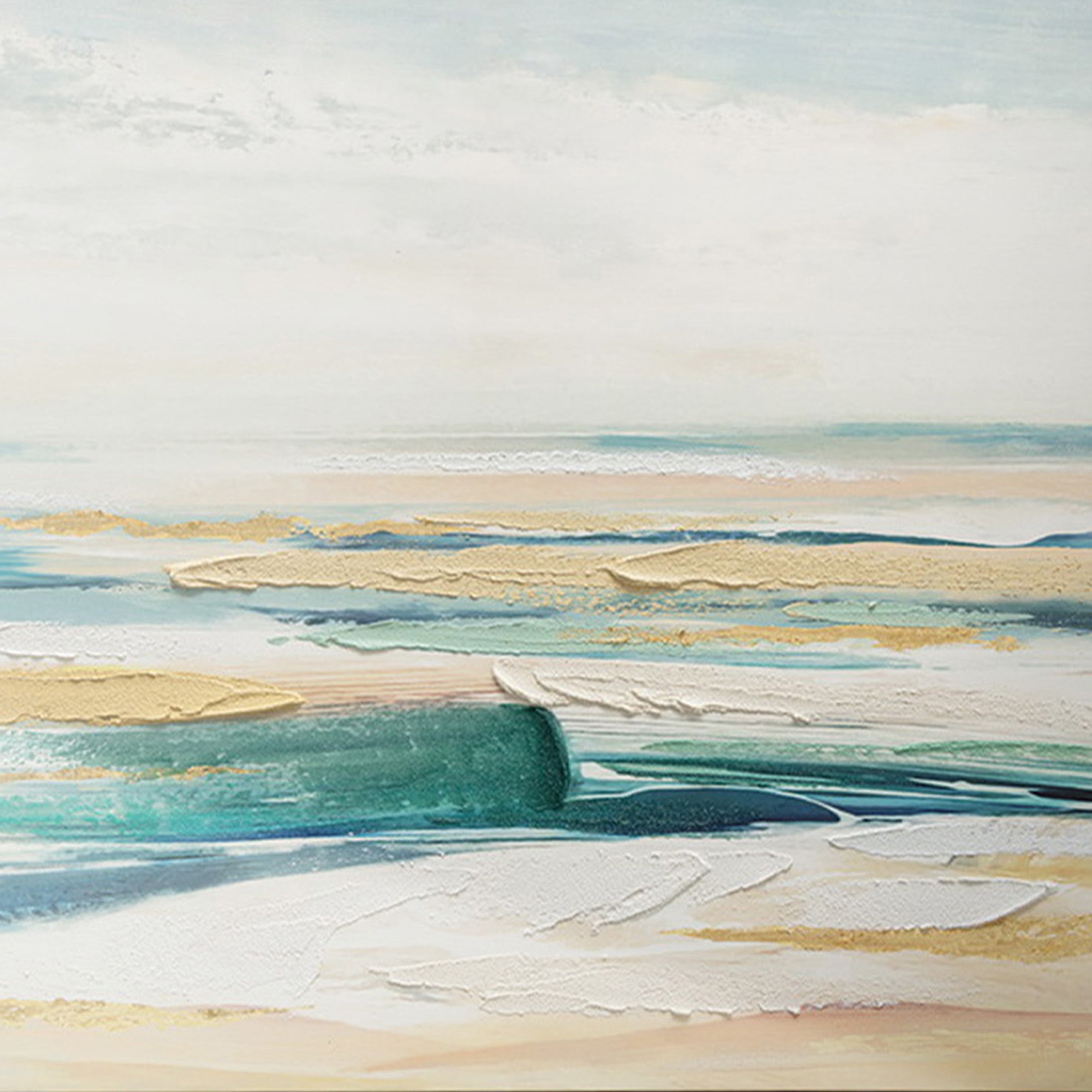 With 87% of Australia's population living with in 50kms of our beautiful coast lines what better art to have on your wall then this Brushmarks Abstract Coastal hand embellished canvas. This abstract canvas print has been skillfully hand embellished with quality oil paints to highlight the sand and sea elements in the design.
