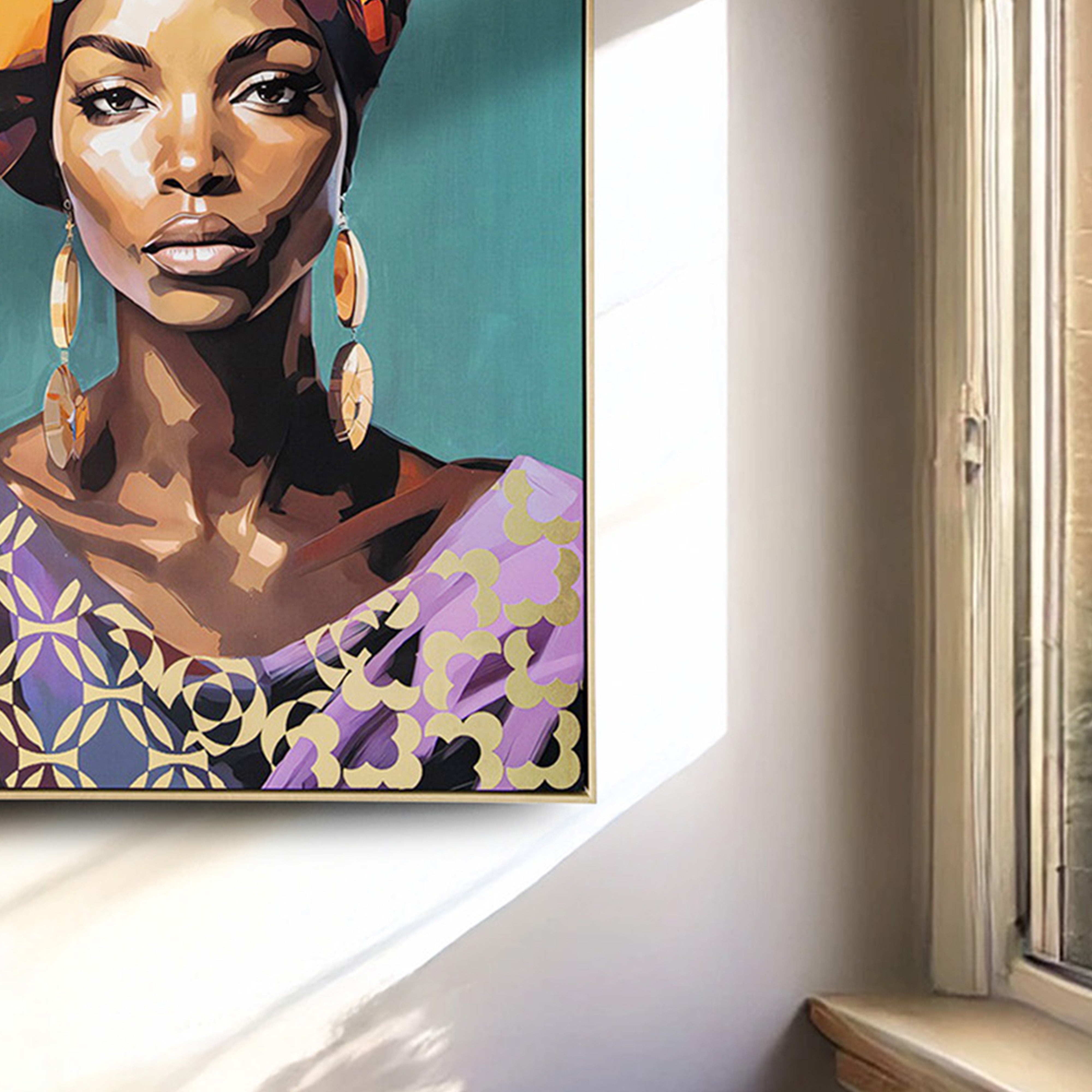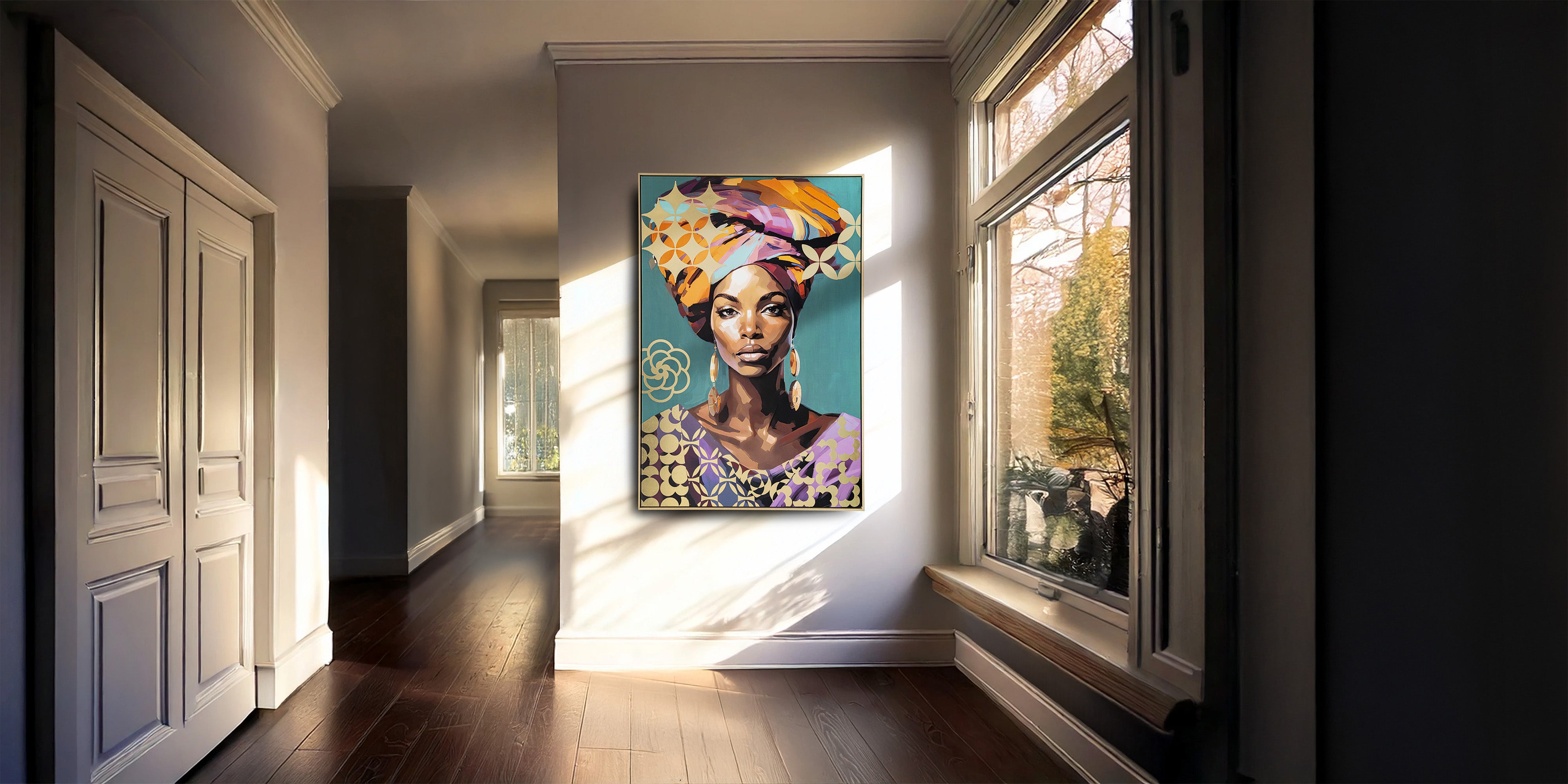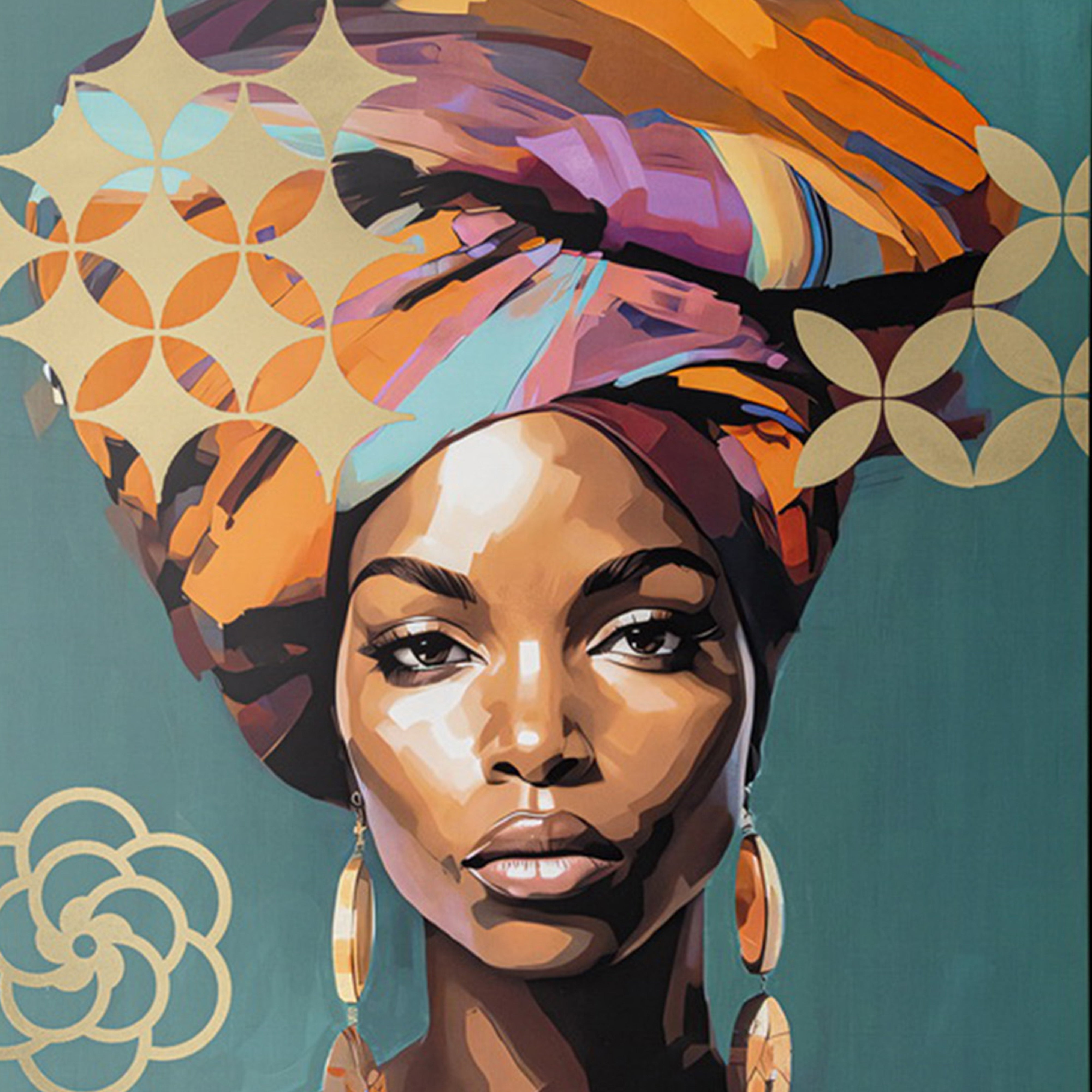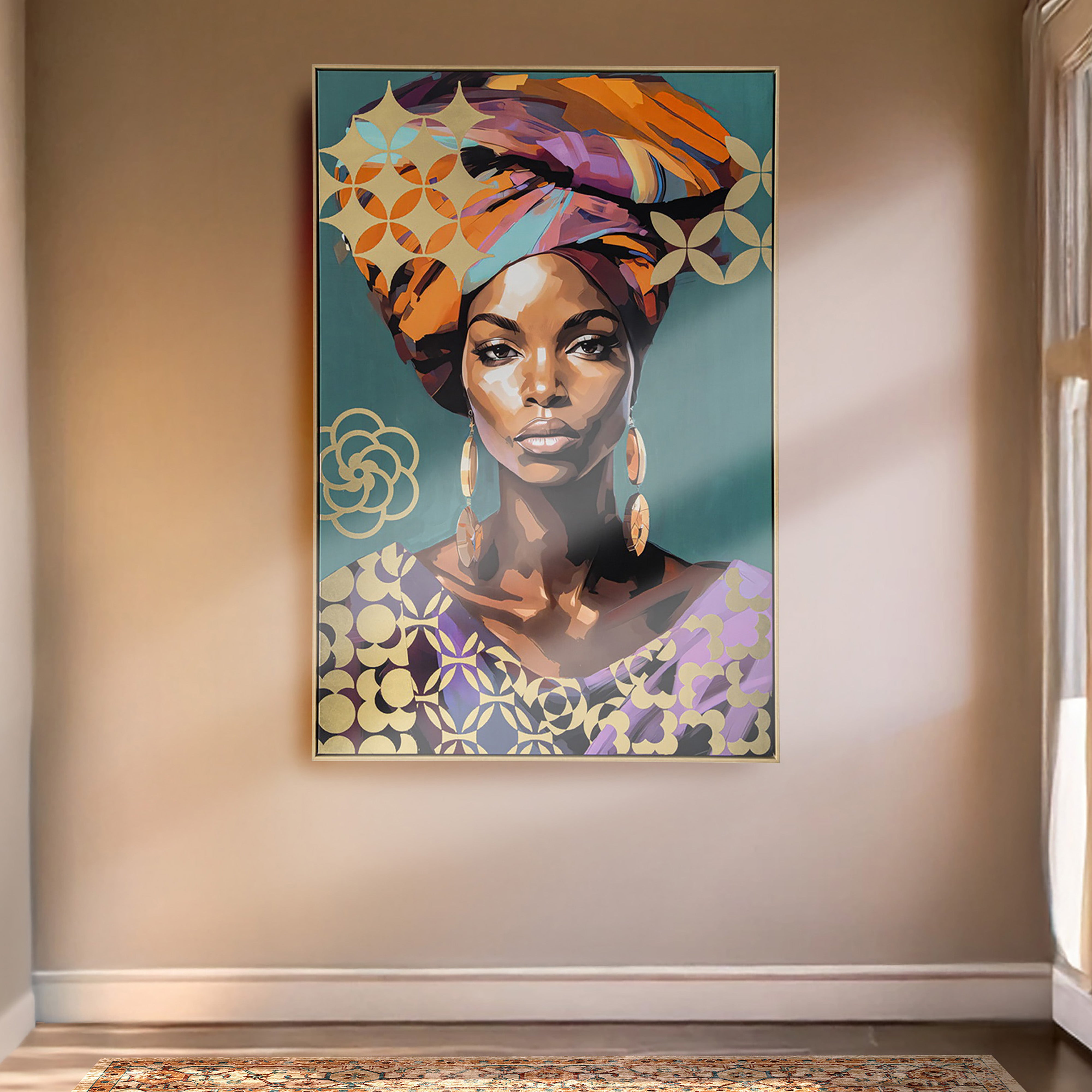 The woman’s serene expression and stylish attire convey a sense of empowerment, grace, and individuality. Her striking presence is complemented by the radiant gold accents, which enhance her elegance and elevate the artwork’s overall appeal. This piece is perfect for those who appreciate art that reflects confidence, beauty, and cultural heritage.