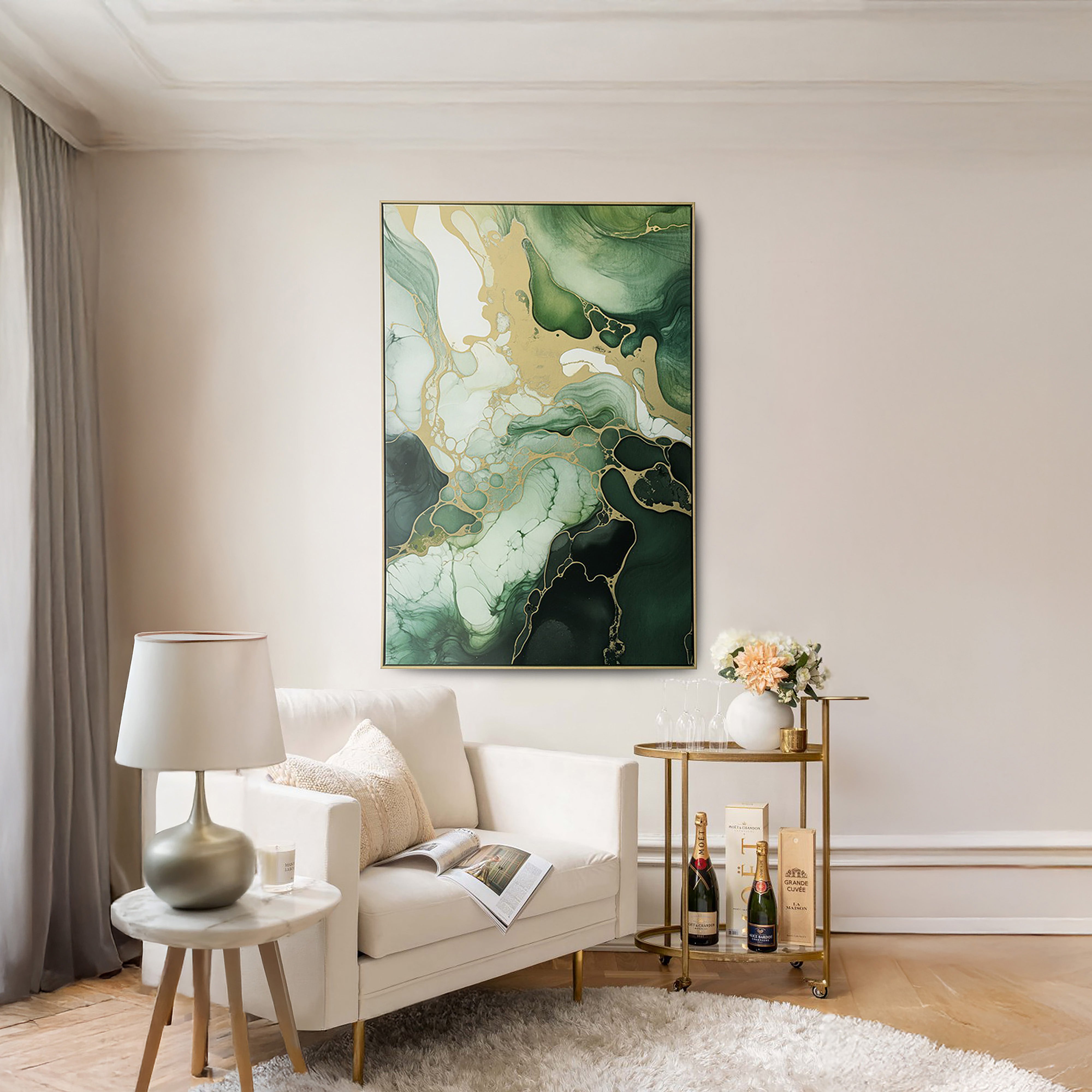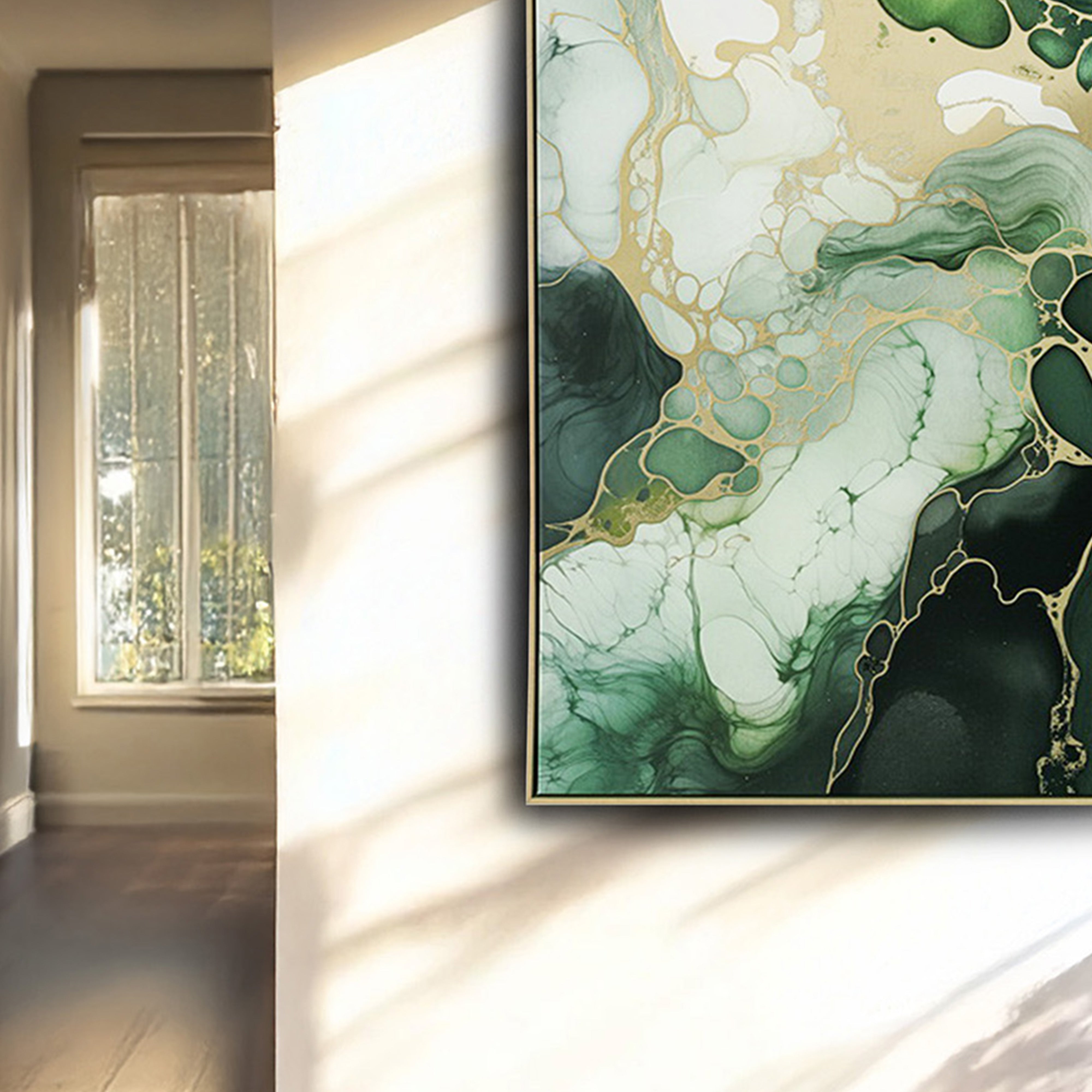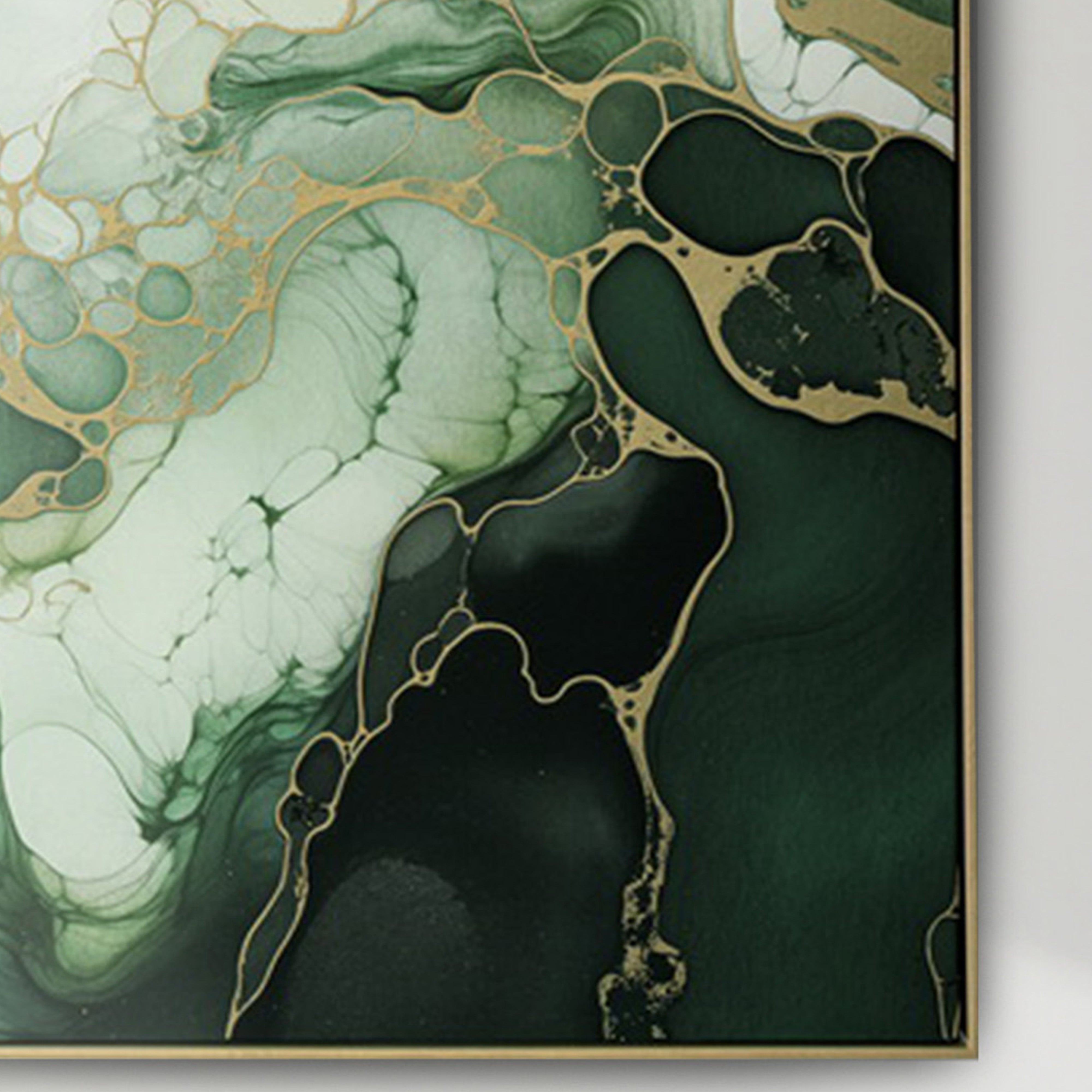 Introducing the Urban Style Brushmarks Gold Foiled Print, featuring a printed canvas on a sturdy timber support frame. The 3D gold foil embellishment adds depth and dimension to the green marble print perfectly. The wood look plastic décor box frame is expertly fitted around the stretch canvas painting to further add a level of depth and complexity to your art piece. Elevate your space with this unique and expertly crafted piece.