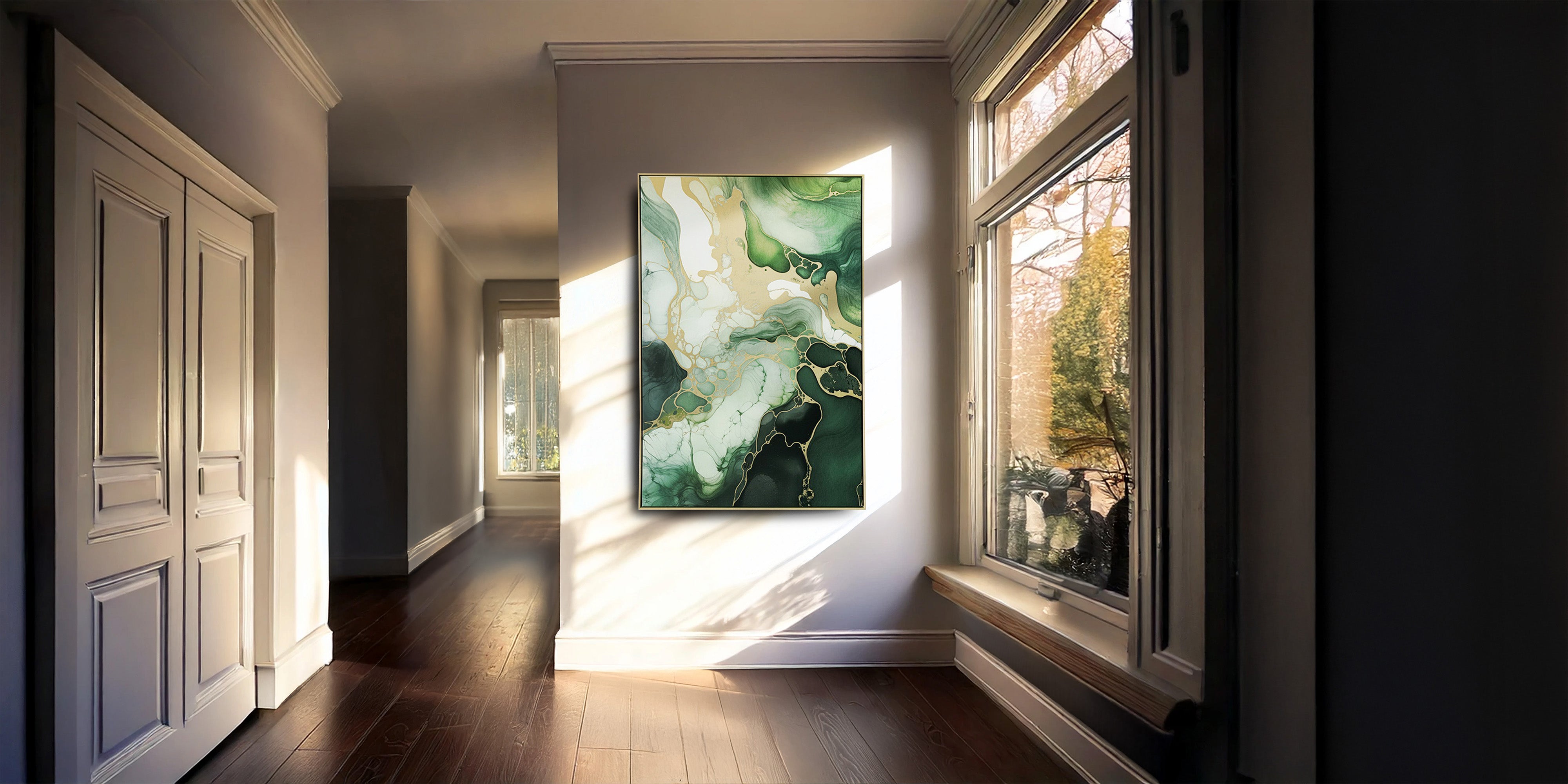 Crafted to capture attention, this painting serves as an instant conversation starter. Its dramatic use of colour, luxurious gold detailing, and fluid art technique create a visually engaging masterpiece that feels dynamic and intriguing. Displayed in an entryway, above a fireplace, or in a prominent place within a living room, this artwork commands attention while complementing its surroundings. It’s the ideal piece for those looking to add a touch of drama and sophistication to their decor.