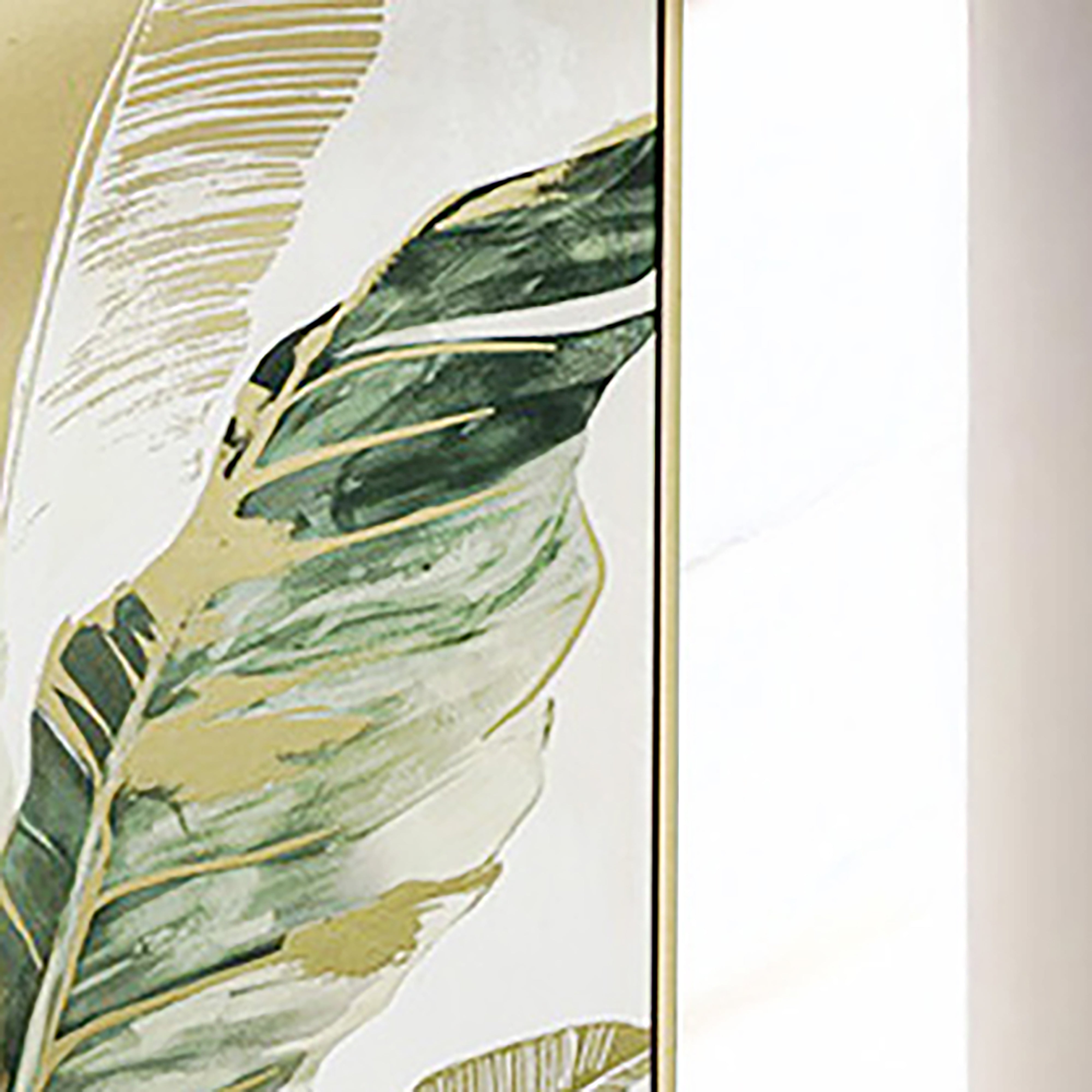 The Gold Foil Embellishments on this Brushmarks Foiled Canvas Palm art piece is used to highlight the structure of the palm leaves and plant. With the cleaver positioning of the gold foil embellishments we can truly appreciate the beauty of nature.