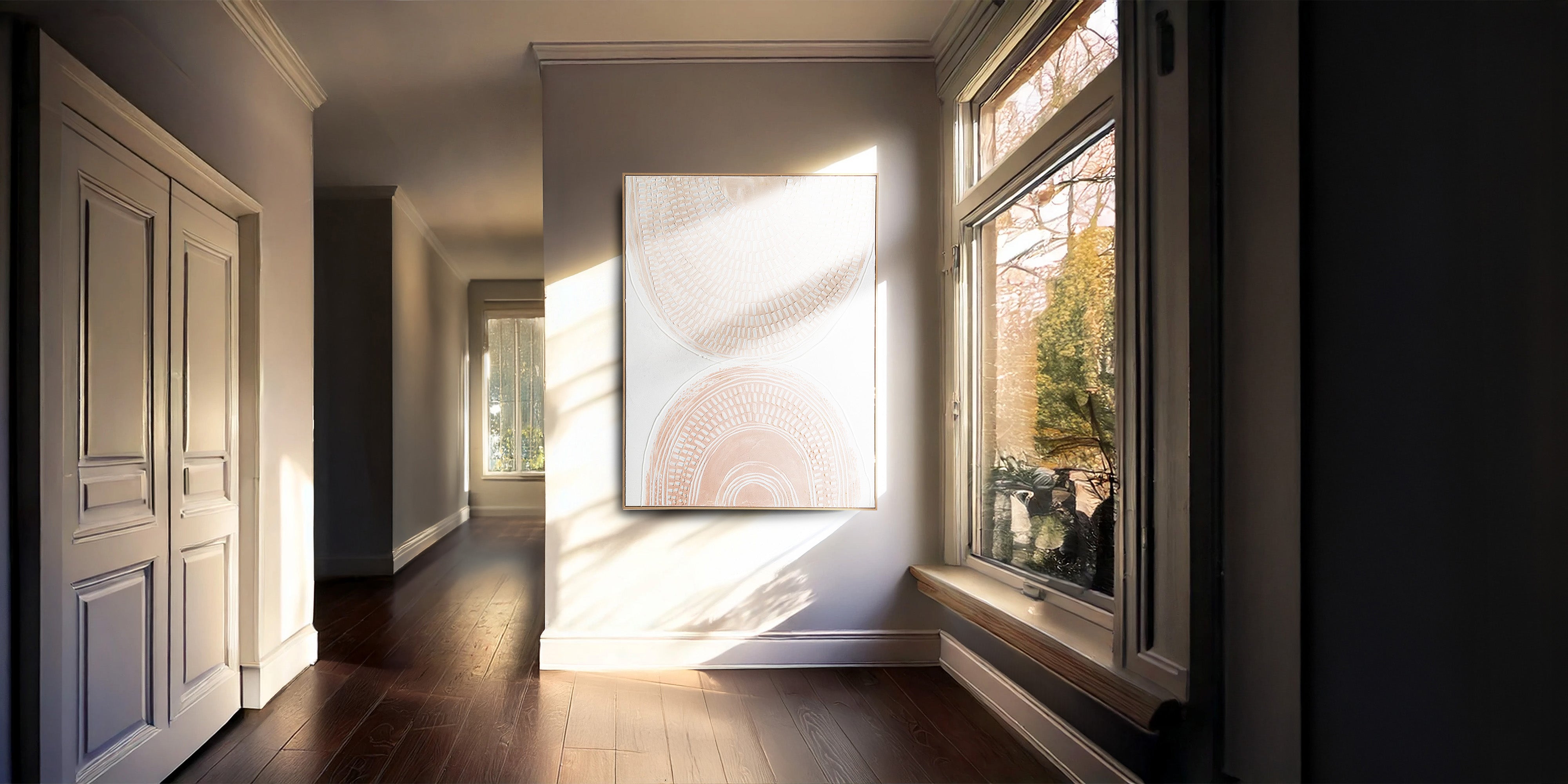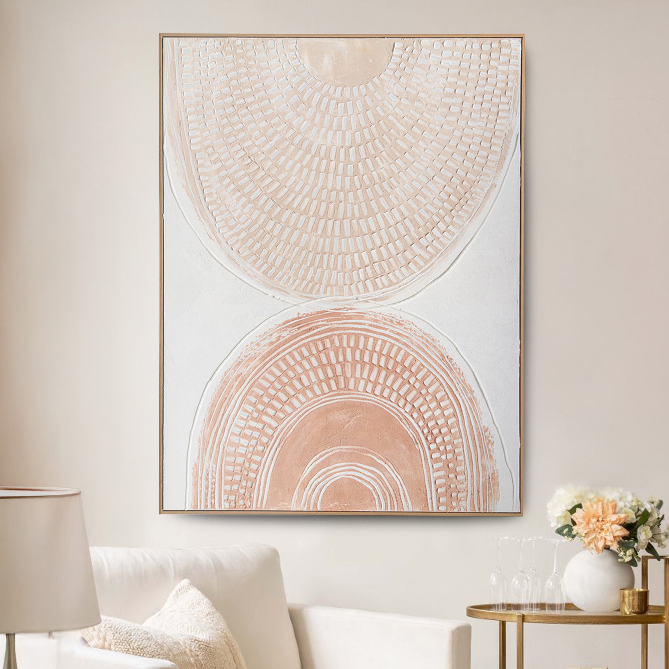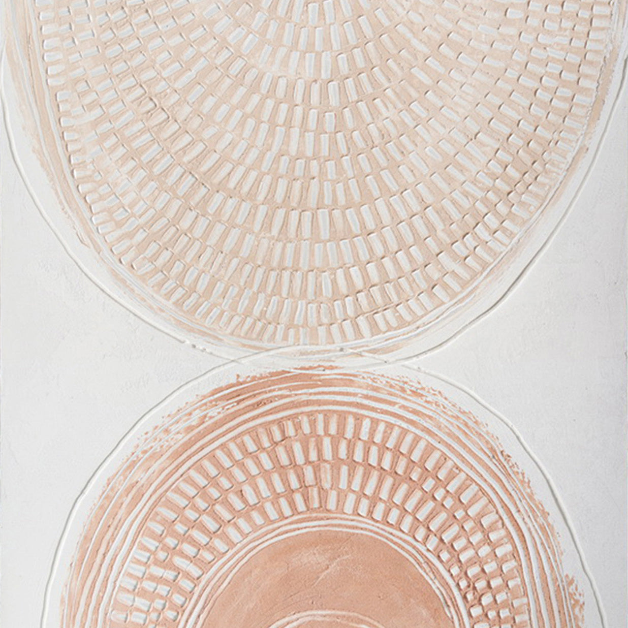 The bold, textured strokes draw the eye, offering a tactile quality that brings depth and dimension to the piece. The subtle interplay of warm earthy tones and white accents enhances the relief effect, inviting viewers to experience the art visually. This handcrafted detailing makes each piece feel unique, embodying craftsmanship and artistic expression that adds sophistication to any space.