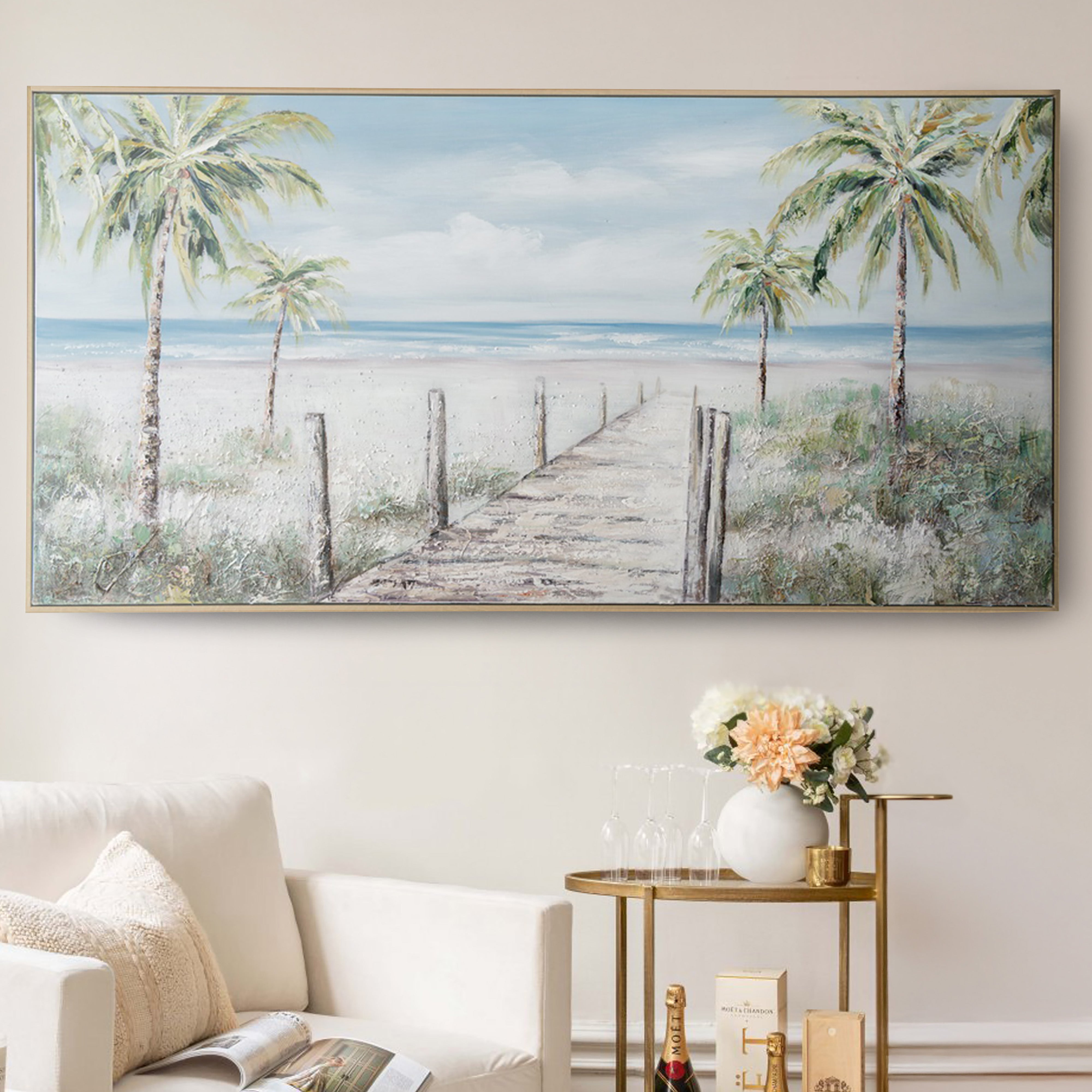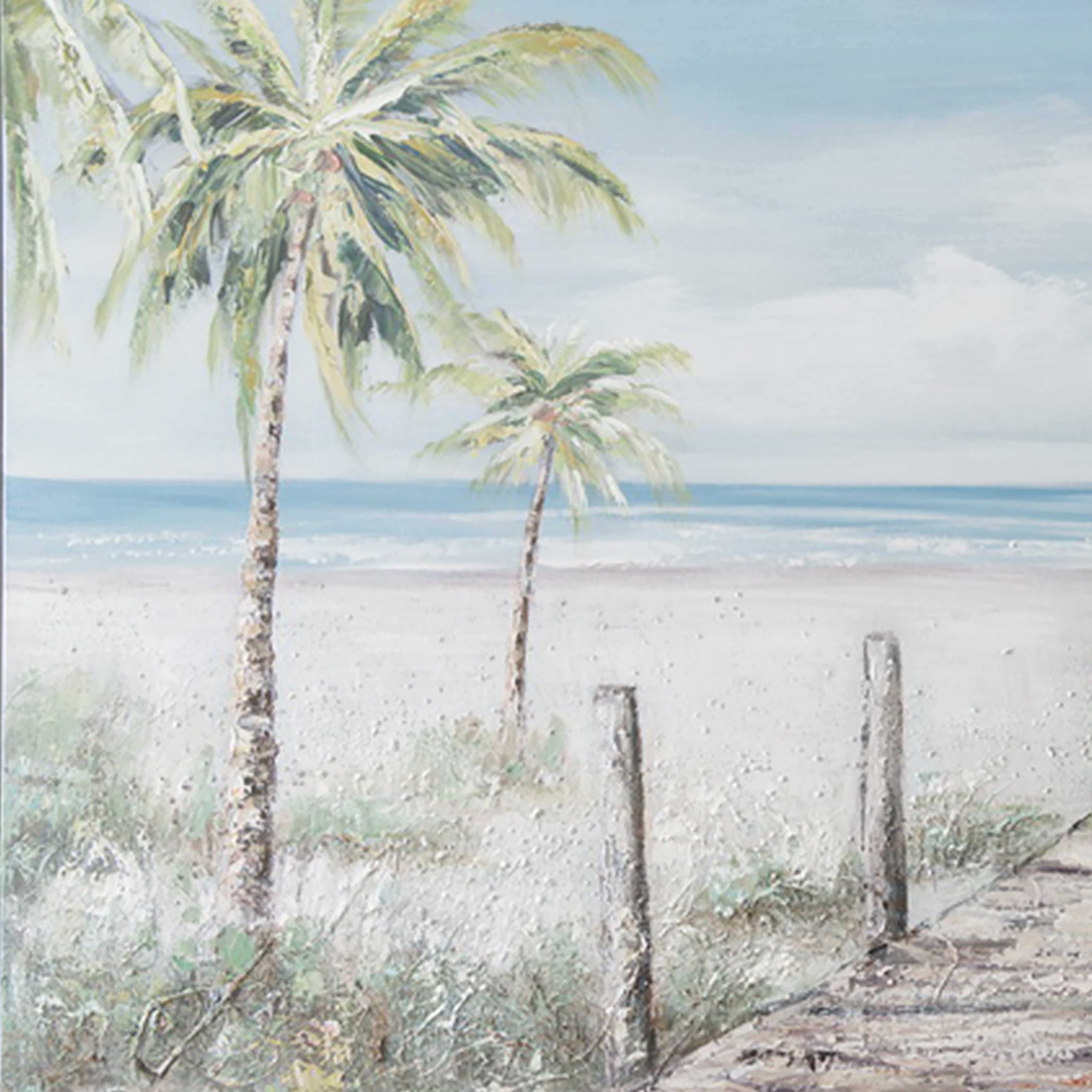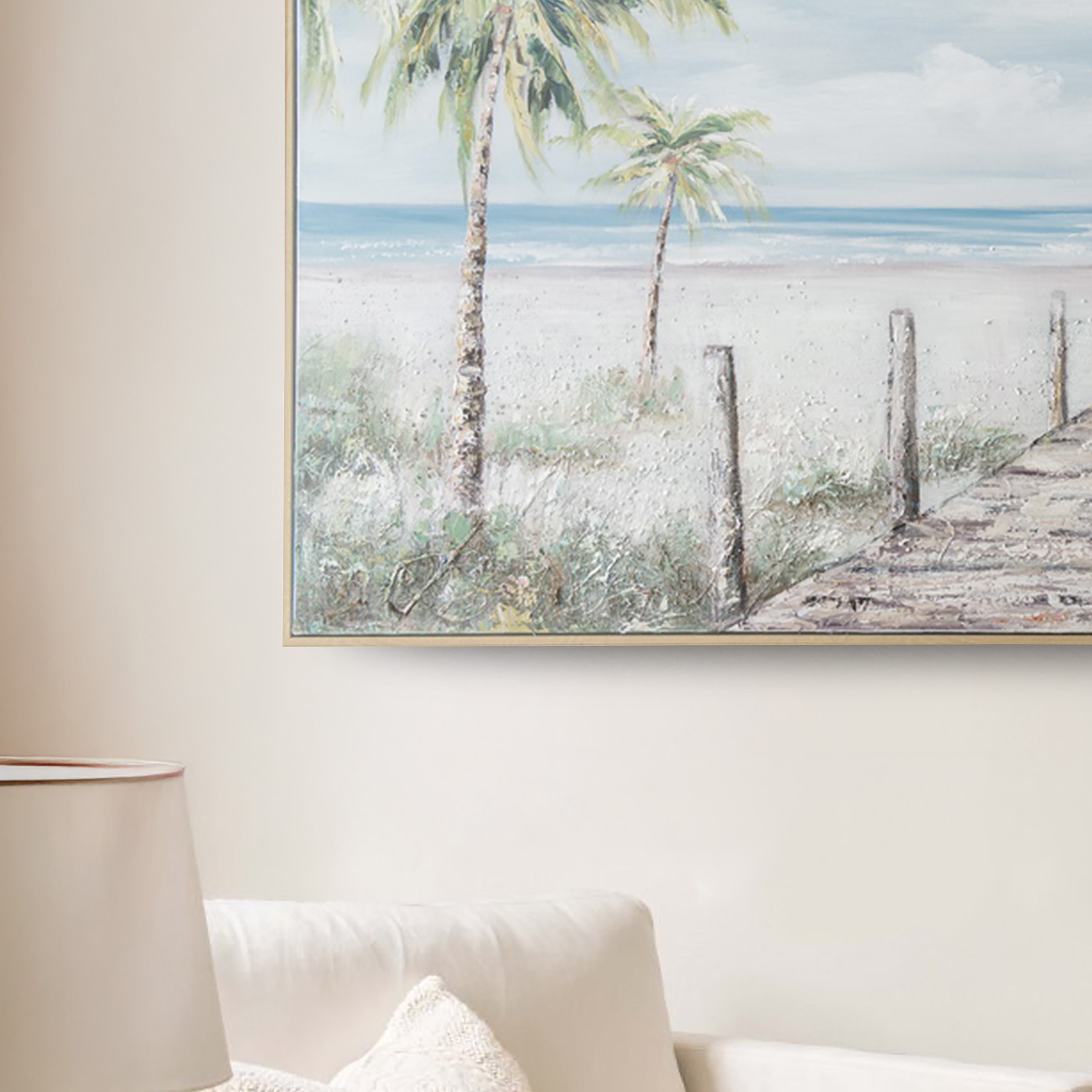 This breathtaking coastal painting captures the essence of serenity through its masterful brushwork. Textured, sweeping strokes create the illusion of soft sand beneath your feet, while delicate yet expressive brush marks form the lush palm fronds swaying gently in the breeze. The artist’s use of impasto techniques adds depth and dimension, making the ocean’s waves shimmer with light. This painting’s tactile quality invites you to reach out and feel the tranquility of the scene, bringing a sense of relaxation and tropical escape into your home. Perfect for brightening any space, it’s a piece that promises to transform your interior with its calming, coastal charm