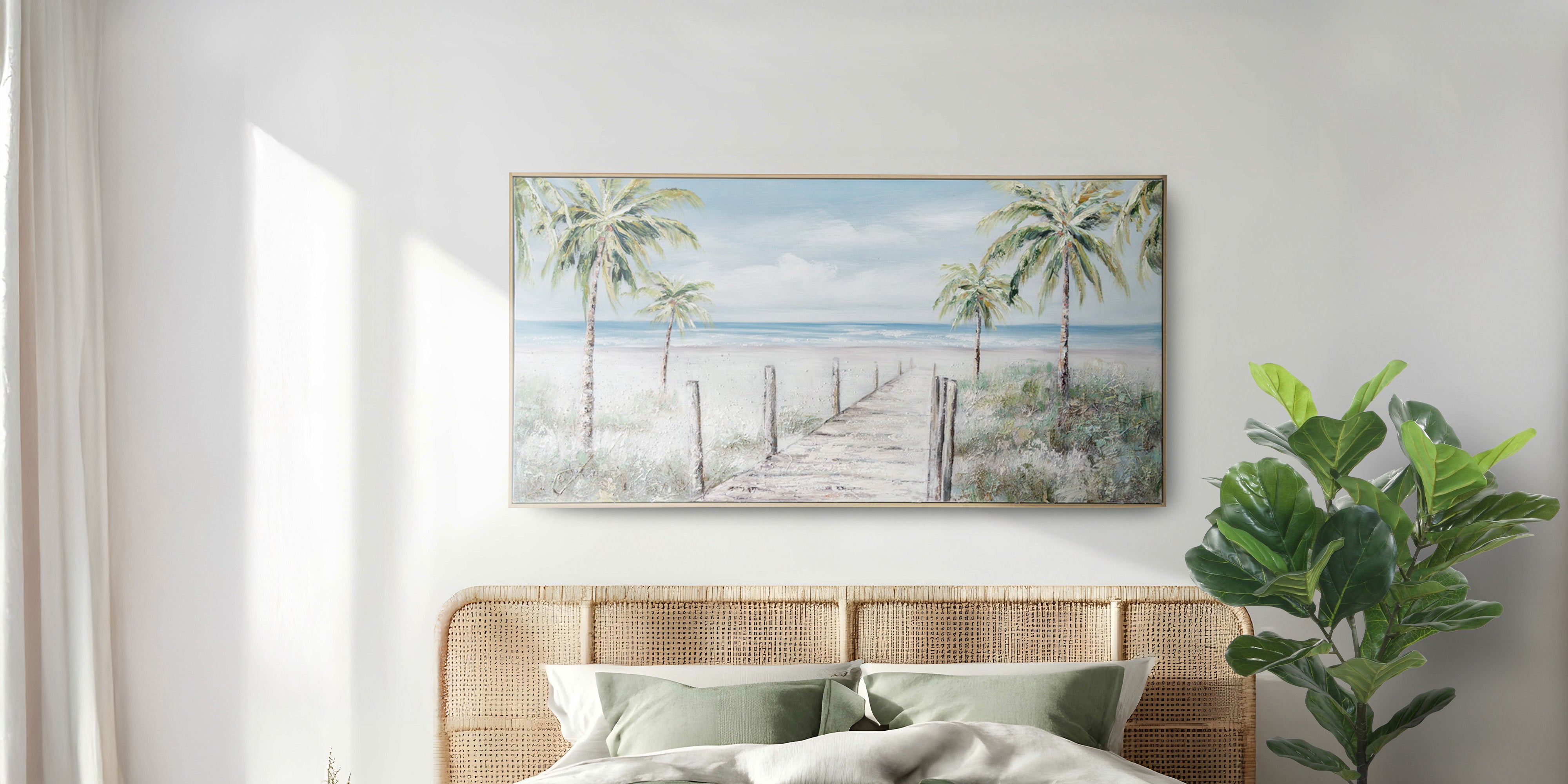 Introducing the Urban Style Brushmarks Oil Painting, featuring a hand painted canvas on a sturdy timber support frame. The 3D textured oil painting adds depth and dimension to the palm tree boardwalk perfectly. The wood look plastic décor box frame is expertly fitted around the stretch canvas painting to further add a level of depth and complexity to your art piece. Elevate your space with this unique and expertly crafted piece.