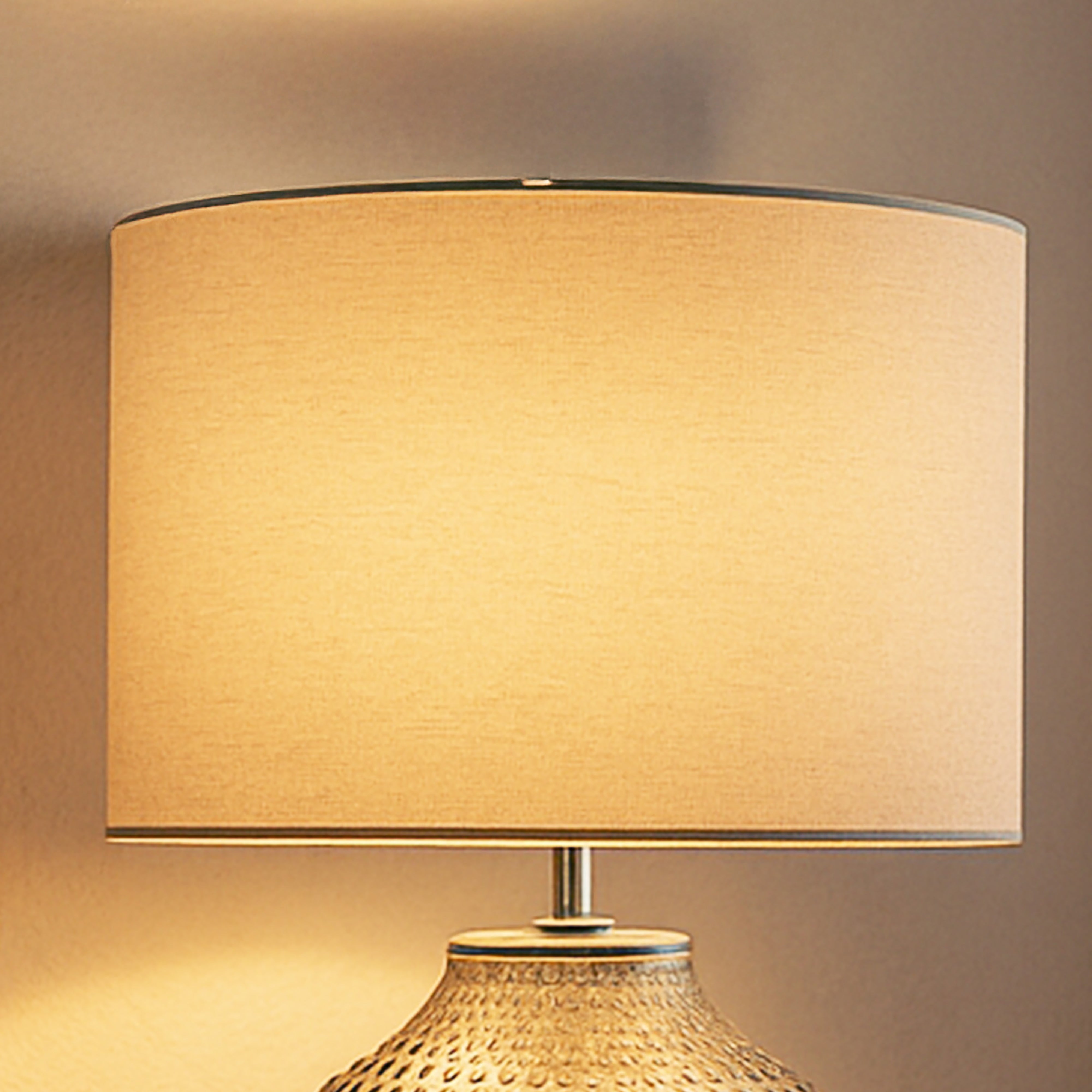 Neutral drum shade casts a calming glow, perfect for evening routines
