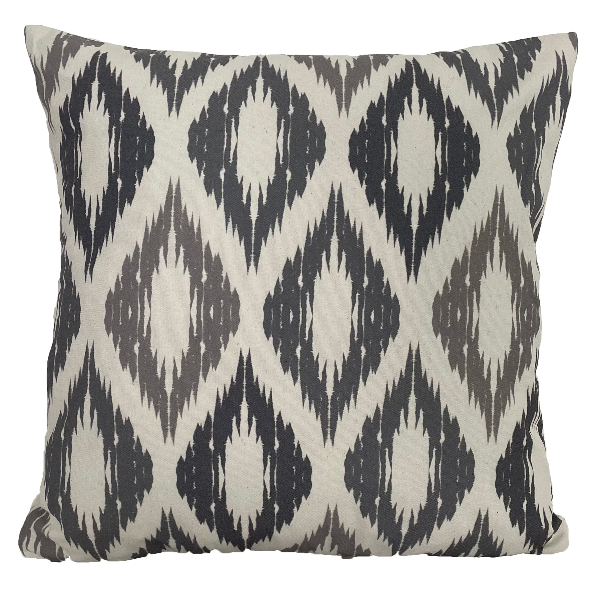The cushion features a strong diamond ikat pattern in contrasting black and grey tones, bringing instant visual interest to any modern or neutral interior.