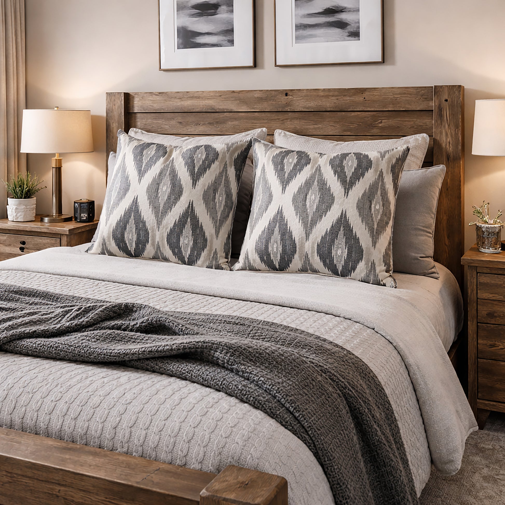 Bold ikat-inspired diamond pattern in a black and grey palette