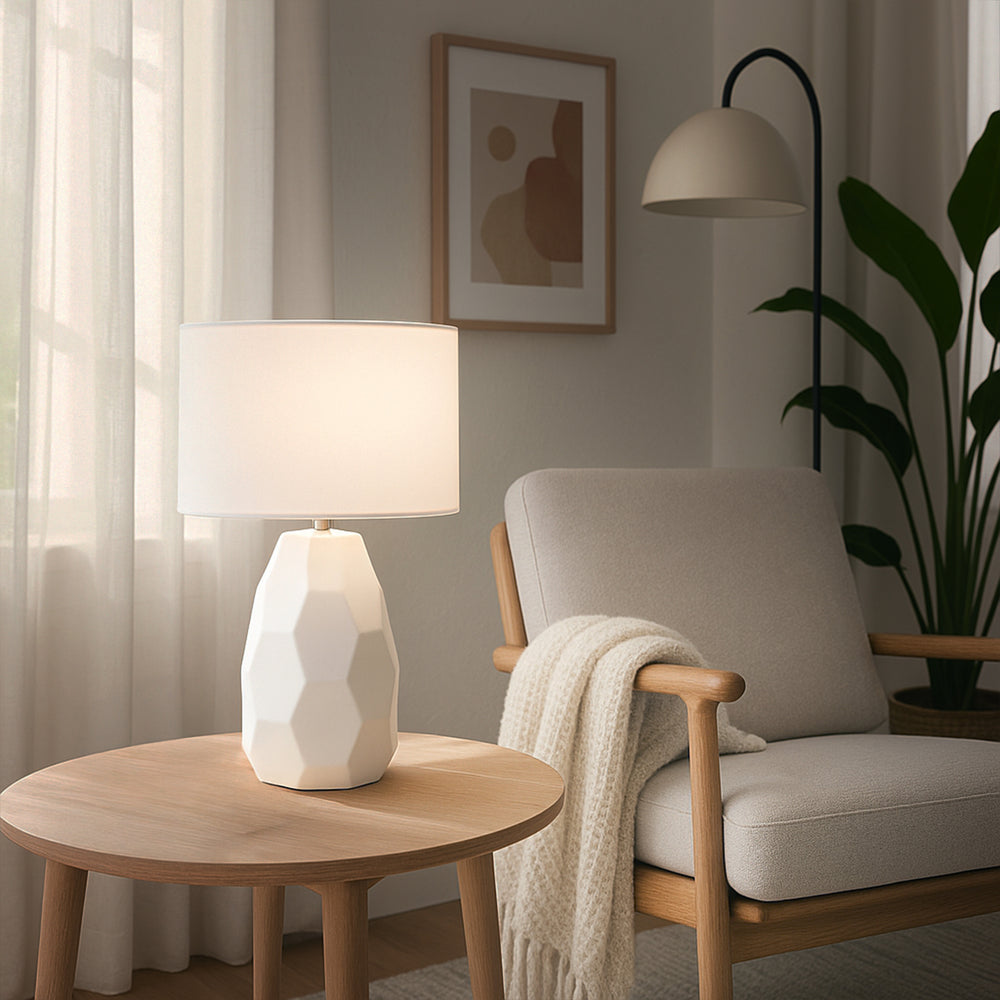 Elevate your living space with the sophisticated silhouette of the Jane Table Lamp from Urban Style. Featuring a crisp clean white ceramic base with a sculptural, faceted design and paired with a matching fabric drum shade, Jane is the ideal statement piece for modern interiors.