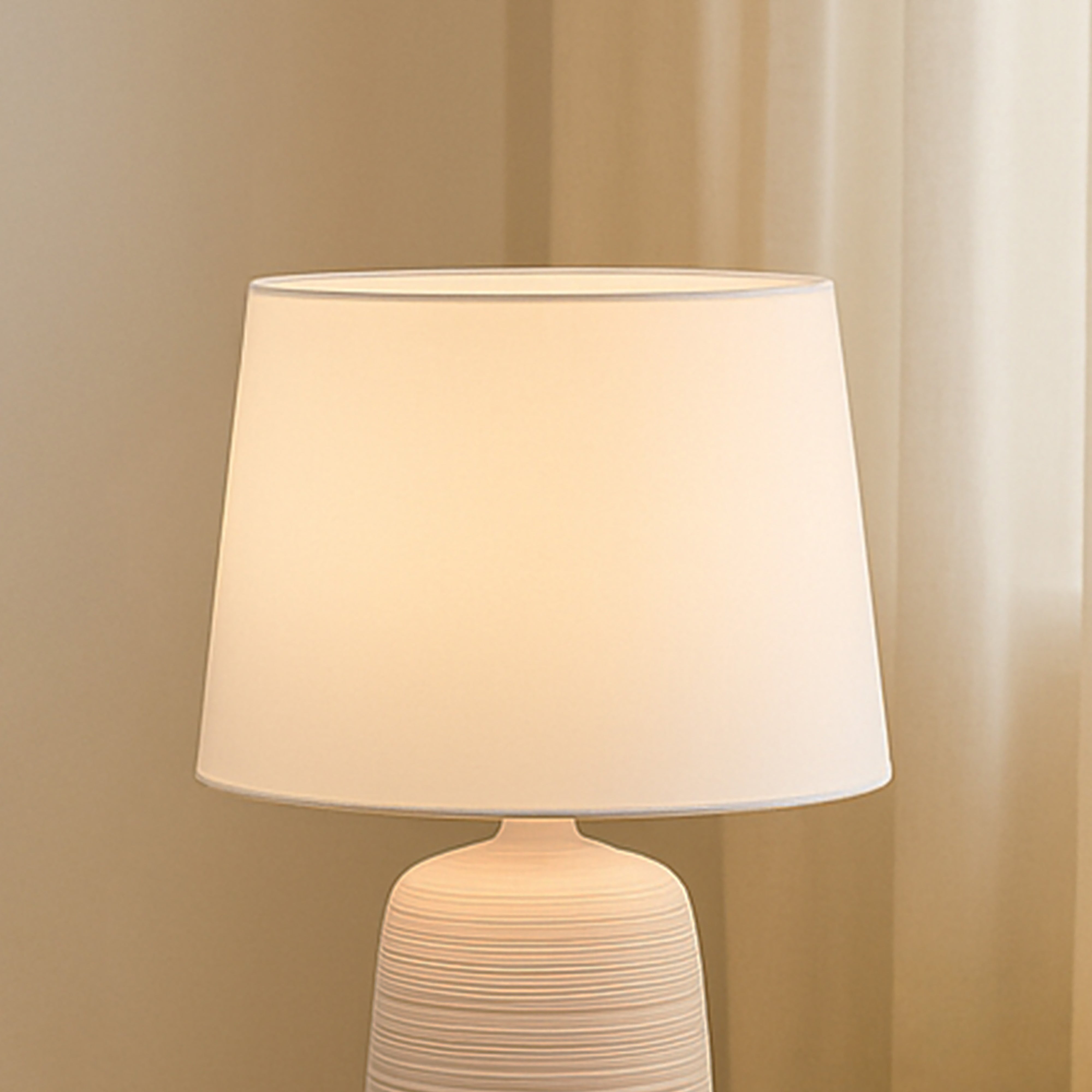 The fabric shade diffuses light gently, ideal for relaxing environments.