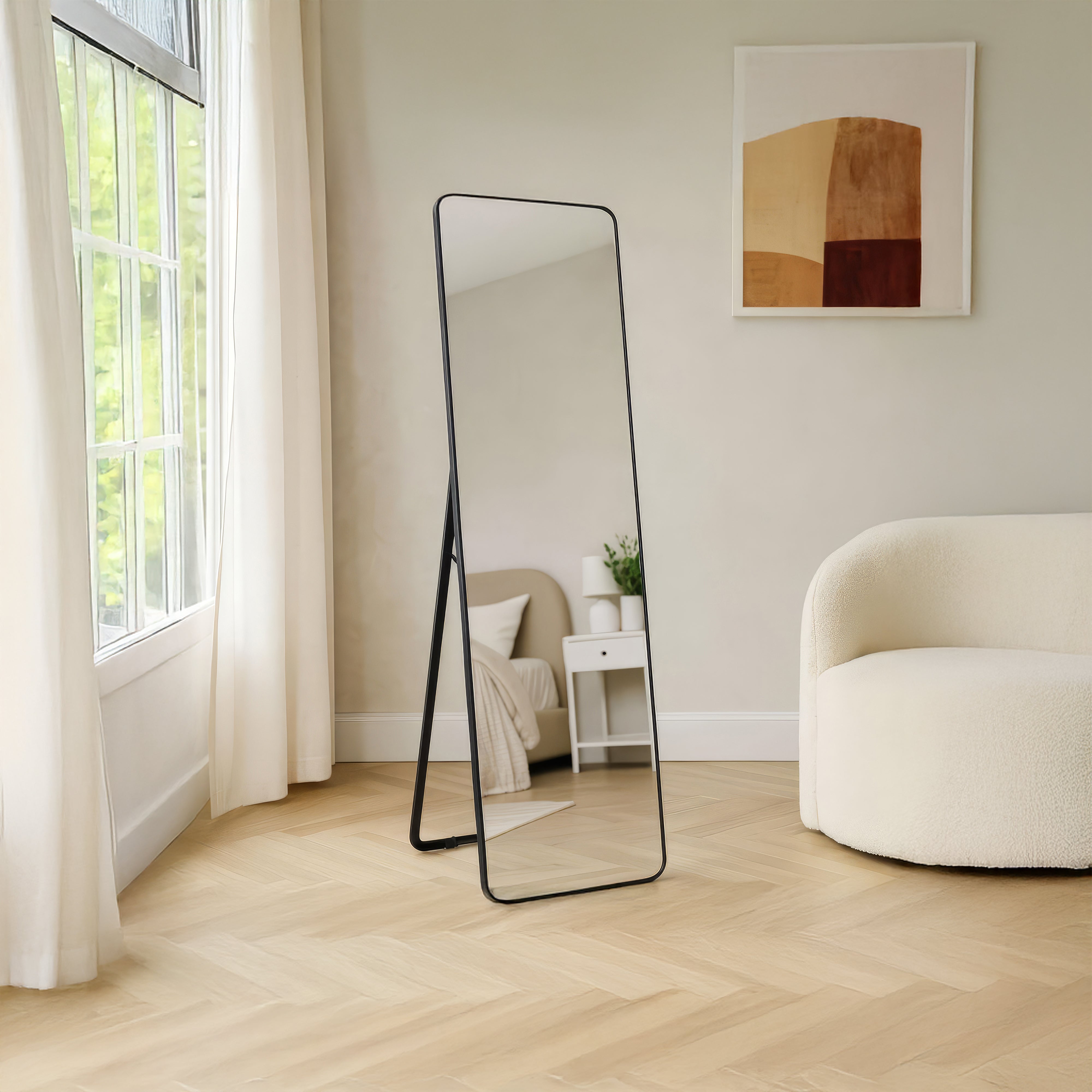 The Reflections Free Standing Mirror in Black by Urban Style introduces a crisp and contemporary edge to any space. Its slimline soft curved corners and striking black finish provide a sophisticated contrast against light and neutral walls, perfect for minimalist or industrial-inspired interiors.